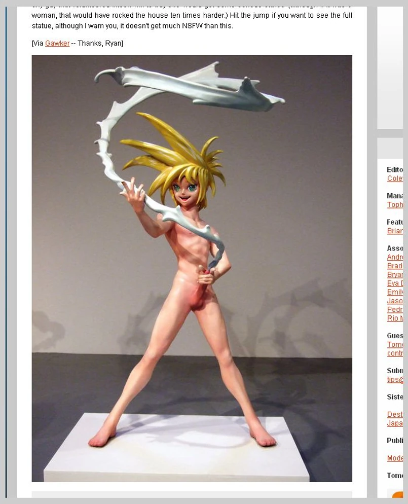 Rzeźba przedstawia młodego mężczyznę podczas ejakulacji. Dzieło jest wykonane w stylistyce popularnego japońskiego komiksu manga, postać o włosach nicyzm żółte kolce stoi w rozkroku, trzymając w dłoniach dorodne przyrodzenie.