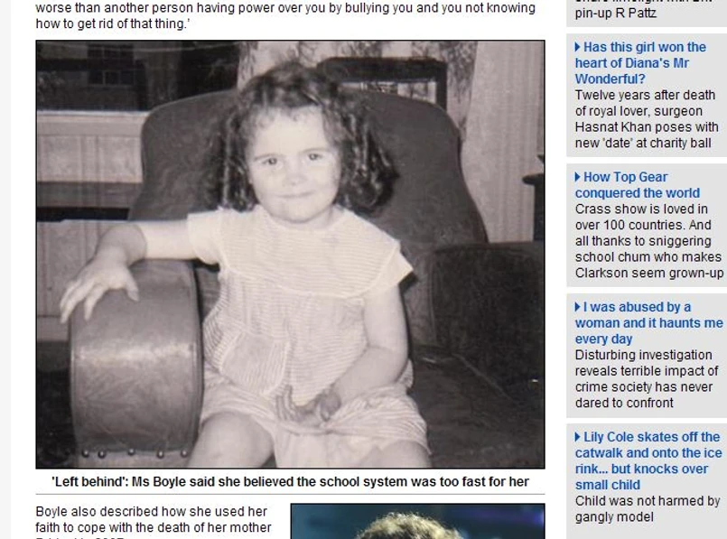 Ze zdjęcia uśmiecha się urocza mała panienka z loczkami - to właśnie Susan Boyle, późniejsza zwyciężczyni „Britain’s got talent”. Mimo urody i talentu muzycznego życie dziewczynki nie było łatwe: „Patrzycie na kogoś, kto codziennie dostawał od nauczycieli lanie pasem” - wyznała w jednym z wywiadów. Nauka nie przychodziła Susan łatwo. Gwiazda przyznaje, że nie nadążała za klasą: Zawsze zostawałam z tyłu, uczyłam się wolno. Po prostu nie łapię wszystkiego tak szybko, jak inni”.