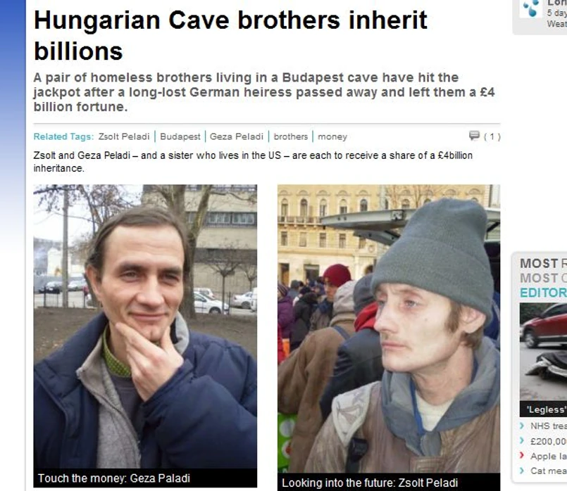 Niedawno głośno było o braciach Peladi. Zsolt i Geza byli tak biedni, że musieli mieszkać w jaskini pod Budapesztem. Pieniądze na jedzenie zdobywali, sprzedając wygrzebane ze śmietnika rupiecie. Choć ich sytuacja była trudna, pozostali przyzwoitymi ludźmi. Nawet w snach nie marzyli, że pewnego dnia dostaną pokaźny spadek, który odmieni ich życie. Pewnego dnia do jaskini zawitał tajemniczy pan, mówiąc, że na braci Peladi czeka 6 miliardów euro (słownie: sześć miliardów!) spadku. Majątek zapisała im babcia.