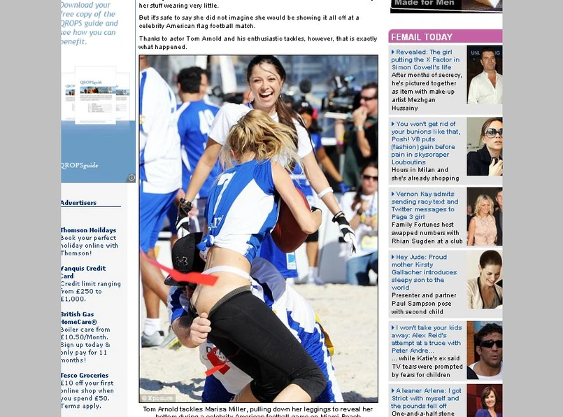 Marisa wzięła udział w imprezie, podczas której gwiazdy dzielą się na dwie drużyny i grają w futbol amerykański. Walka była naprawdę zażarta! Podczas rozgrywki w Miami Beach modelka zwarła się w uścisku z aktorem Tomem Arnoldem. Efektem było nie tylko przechylenie się szali zwycięstwa na jedną ze stron. W szarpaninie Marisa została pobawiona leginsów. Oczom zgromadzonych ukazała się szalenie zgrabna pupa modelki.