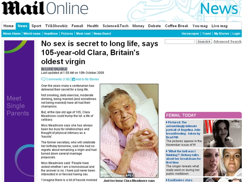 Clara Meadmore zapewnia, że miała kilka propozycji wyjścia za mąż, jednak już jako 12-latka zdecydowała, że zostanie panną i danego sobie słowa dotrzymała. "Miałam wielu przyjaciół, mężczyzn, ale były to związki platoniczne i nigdy nie kusiło mnie, by coś zmienić" - zapewnia.