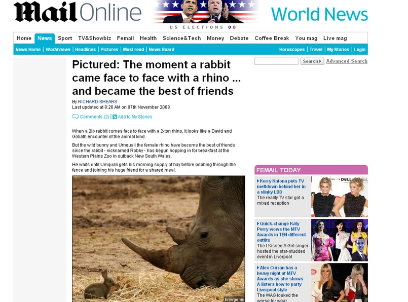 Robby, bo tak nazwali królika pracownicy zoo, jest najodważniejszym ze stada, które żyje na australijskich łąkach koło wielkiego parku zwierząt. Dzień w dzień podchodził bliżej nosorożców, aż wreszcie zdecydował, że te wielkie bestie nic mu nie zrobią. I przyszedł na podwieczorek.