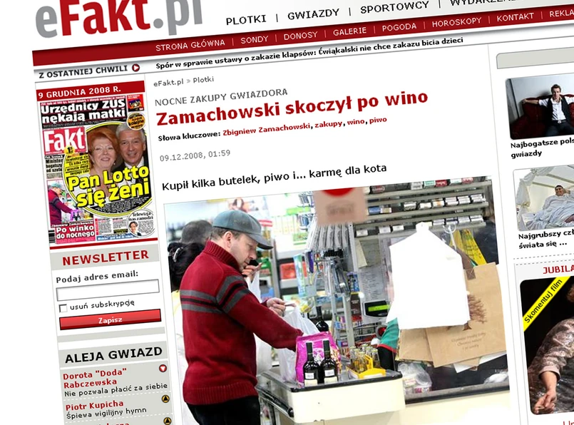 Kilka dni temu widziano znanego aktora w nocnym sklepie, gdzie pojechał uzupełnić domowe zapasy. Wsadził do koszyka kilka butelek wina, piwo oraz karmę dla kota. Z pewnością zwierzak musiał być głodny i czekał na kolację, bo Zamachowski szybko odjechał - relacjonuje "Fakt" wydarzenia spod sklepu.