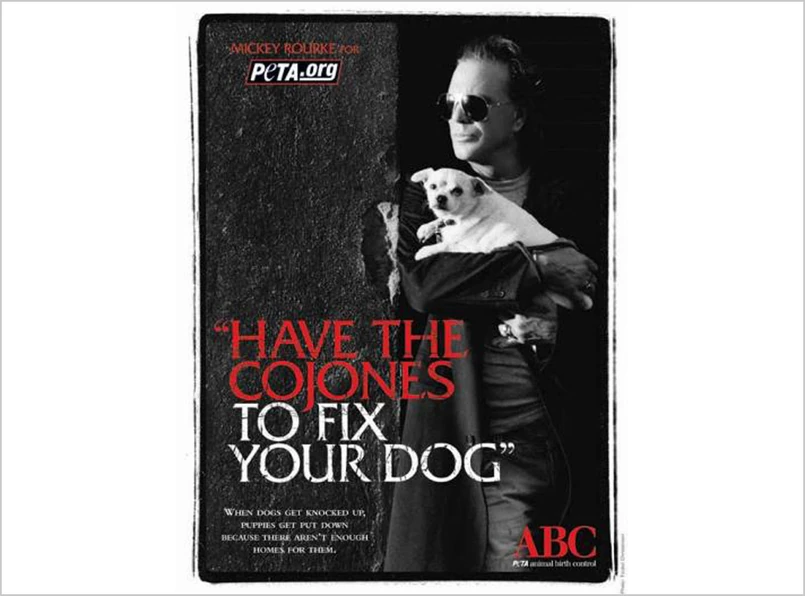 "Gdy psy zaliczą wpadkę, szczeniaki zaliczają schronisko, bo nie ma dla nich domów" - wyjaśnia napis u dołu reklamy. 52-letni Mickey pozuje na niej ze swoim białym chihuahua o wdzięcznym imieniu Jaws (Szczęki). Ten odważny plakat to część kampanii informacyjnej PET-y o konieczności sterylizacji psów i kotów. Aktorł wsparł organizację także występem w filmiku: "Dużo się dowiedziałem, jak wiele psów jest porzucanych lub usypianych każdego tygodnia. To szokujące" - opowiada Rourke. "Najważniejsza rzecz w posiadaniu i kochaniu swojego psa to zachowanie go przy sobie do końca jego życia".