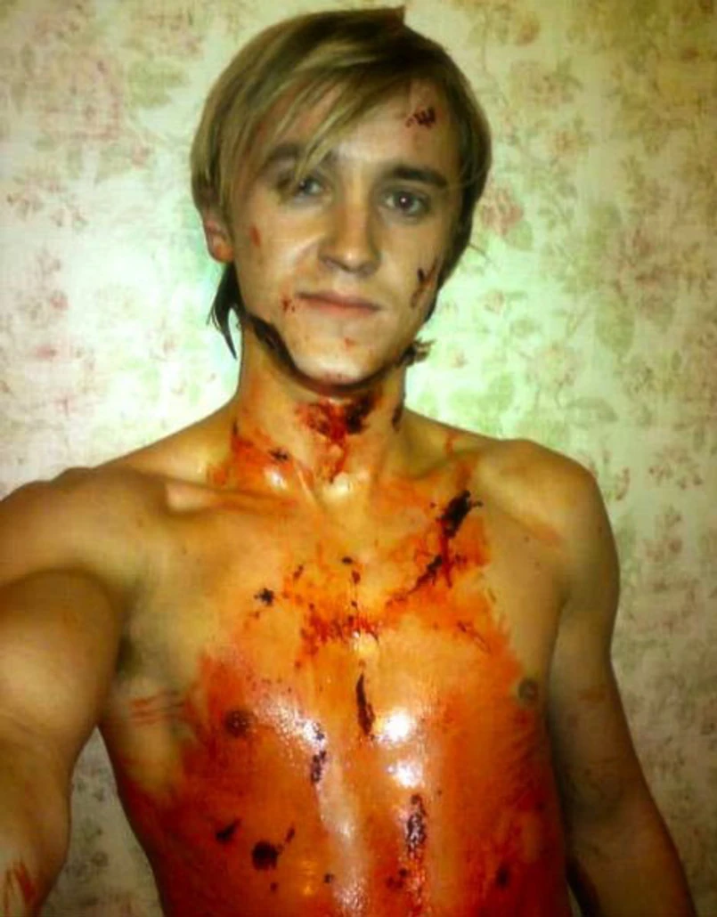 Najnowszy film o młodym czarodzieju Harrym Potterze chyba nie będzie odpowiedni dla dzieci! W sieci pojawiły się zdjęcia, które zrobił sobie jeden z aktorów filmu po całym dniu zdjęć. Tom Felton, odtwórca roli demonicznego i złego do szpiku kości Draco Malfoya, zamieścił w internecie zdjęcie, na którym jest cały we krwi.