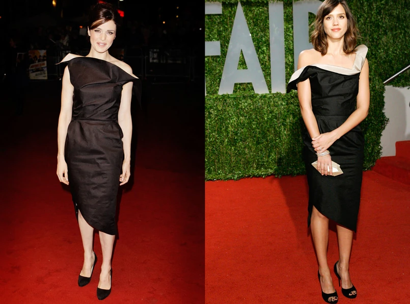 Czarna kreacja o ciekawym fasonie od Ronalda Maureta, ozdobiona białym elementem przy szyi, spodobała się i Jessice, i Rachel. Z tym że Weisz w swojej przyszła na premierę filmu "Bracia Bloom", która miała miejsce jeszcze w 2008 roku. Alba natomiast swoją założyła na galę Oscarów.