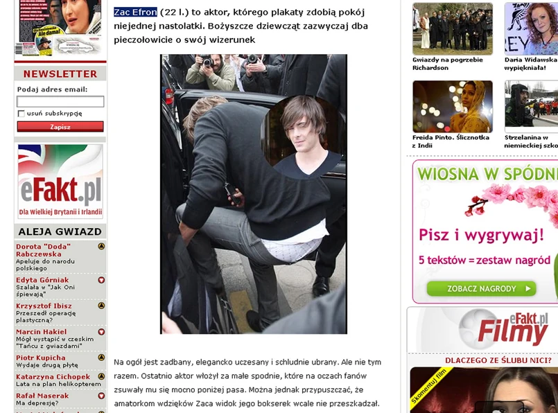 A tak świecił mało pociągającymi białymi majtami... Biały kolor co prawda pasuje do jego wizerunku schludnego chłopca, ale wyskakujące spod za ciasnych spodni białe bokserki w ciapki świecące na wypiętej pupie aktora to nie jest widok, który jego fanki chciałyby zapamiętać... A może się mylimy? Naszym zdaniem buzię ma znacznie ładniejszą.