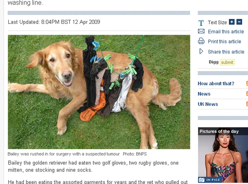 W żołądku zwierzęcia znaleźli kilka rękawiczek, rajstopy, skarpetki, papierowy ręcznik, chusty, rękawice golfowe i do rugby. Łącznie z trzewi Bailey'a wyciągnięto 17 różnych niejadalnych obiektów.