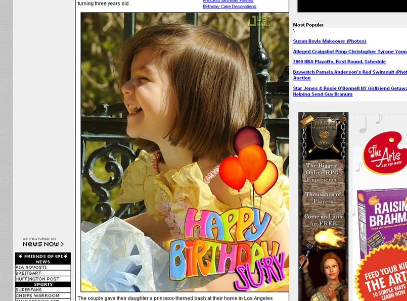 Biedna mała Suri nie mogła w spokoju zjeść tortu i pobawić się ze słynnymi maluchami innych słynnych rodziców. Bowiem nad domem Katie Holmes i Toma Cruise’a w Beverly Hills bezustannie krążyły śmigłowce i helikoptery wynajęte przez fotoreporterów, którzy usiłowali zdobyć zdjęcia całego towarzystwa.