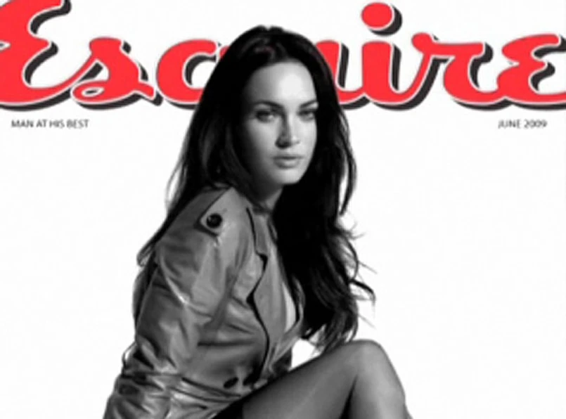 Kusząca Megan kuca na zdjęciu w czarnych szpilach i pończochach. Ma rozpuszczone włosy i lekko rozchylone, namięne usta. Z namiętnym powłóczystym wolno odsłania czarny płaszcz i pokazuje zgrabną nogę.