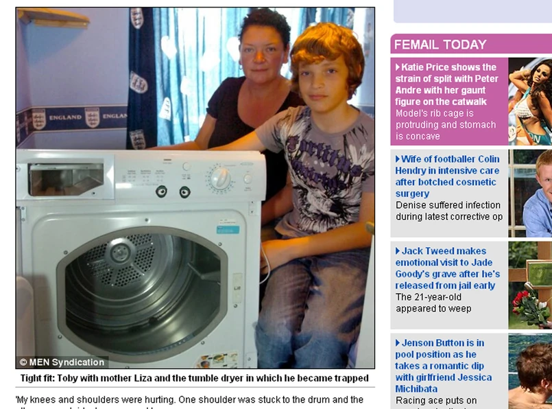 Pomysłowość jedenastolatków nie zna granic. Gdy tylko Toby, angielski młodzieniec, zaczął wchodzić do wnętrza suszarki, nic nie zapowiadało katastrofy. Dopiero gdy już połową ciała wszedł do środka, bęben się przesunął i zaklinował biedaka. Próby uwolnienia się ze szponów sprzętu AGD kończyły się tylko jękami z bólu. W końcu usłyszeli je rodzice młodzieńca i przybiegli sprawdzić, co się dzieje.