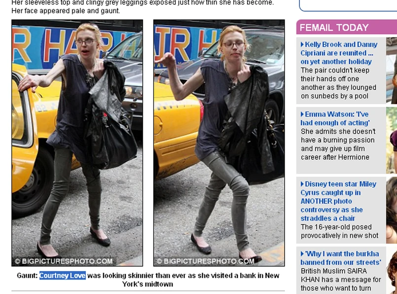 Na tym punkcie jednak się nie zatrzymała, co można zobaczyć na zrobionych jej kilka dni temu zdjęciach podczas spaceru po ulicach Nowego Jorku. Ramiona pozbawione mięśni i tłuszczu, podobnie cienkie jak patyczki nogi, zapadnięte policzki i niezdrowa bladość Courtney naprawdę martwią jej fanów. Wychudzony wygląd podkreśliły jeszcze niefortunnie założone legginsy i luźna koszulka bez rękawów. Przy tak kruchej sylwetce głowa zrobiła się nieproporcjonalnie duża, a i tak ogromne oczy i usta Love jeszcze bardziej się uwydatniły, przez co wygląda teraz groteskowo.