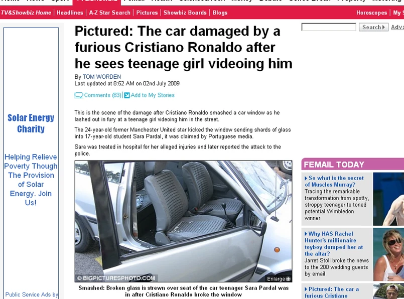Rozgniewany Ronaldo wybił szybę w samochodzie, gdy dostrzegł, że jest filmowany przez pewną nastolatkę. Jak donoszą portugalskie media, futbolista użył swojego morderczego kopniaka do pozbawienia wozu okna. Nielegalnie nagrywająca go 17-latka doznała niegroźnych obrażeń. Do incydentu doszło w niedzielę w Lizbonie, gdzie sportowiec relaksował się przed kolejnymi występami.