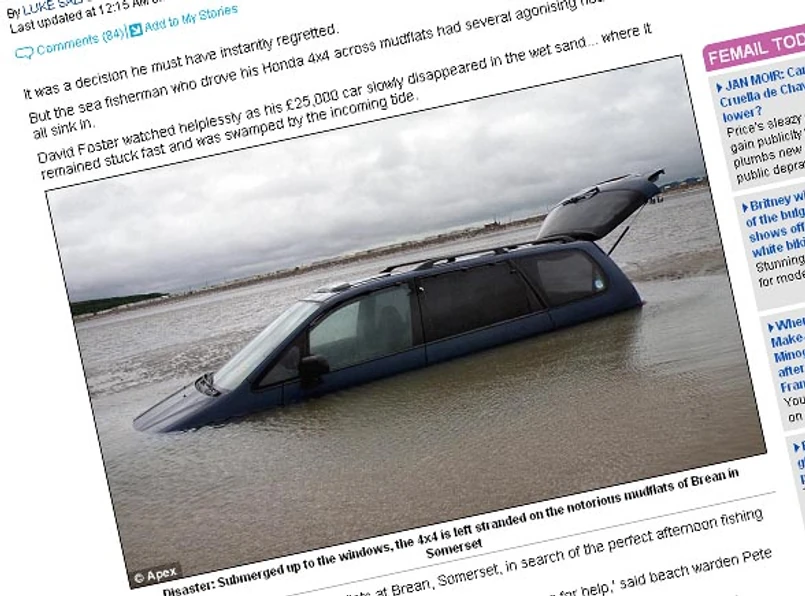 Tej decyzji na pewno będzie żałował. Pewien morski rybak, który wjechał swoją Hondą z napędem na cztery koła na plażę, przeżył kilka męczących godzin, patrząc bezradnie, jak jego auto za 25 tysięcy funtów powoli znika w mokrym piasku, zanim zostało całkowicie zalane przez nadciągający przypływ.