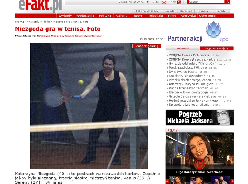 Kasia, odziana w skąpy sportowy strój, machała rakietą niczym trzecia siostra Williams - tak zresztą przedstawił całą sytuację tabloid. Podobno była pani prezes ma wielki talent do tenisa, a dodatkowo dysponuje sporą siłą. Pochwalamy wszelką aktywność fizyczną i mamy nadzieję, że gdy pani Kasia dostanie już pracę, to nie zaniecha treningów. Wszak to nie byle jaki wydatek energetyczny!