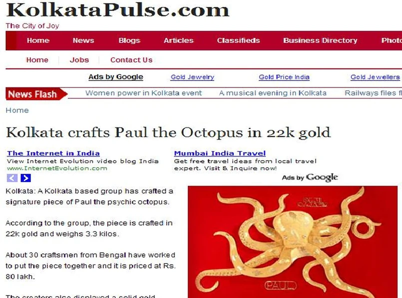 30 najlepszych złotników z firmy Shree Ganesh Jewellery zużyło ponad trzy kilogramy złota, by stworzyć idealną podobiznę Paula. Pokazali ją na Międzynarodowych Targach Biżuterii w Indiach. Cacko jest na sprzedaż, a za złotą ośmiornicę trzeba zapłacić aż 171 tysięcy dolarów - podaje portal "Kolkata Pulse".