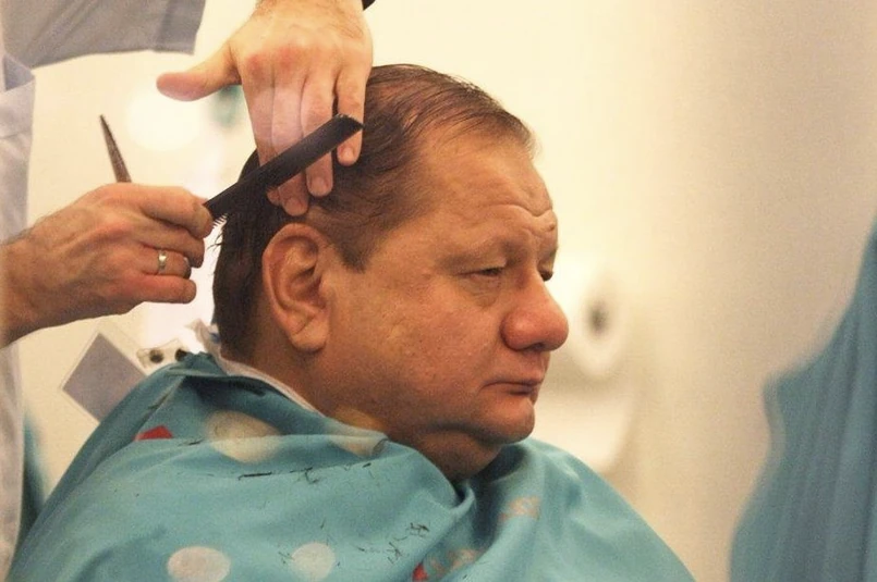 Najpierw kuracja specjalną pianką, potem delikatne strzyżenie i Ryszard Kalisz opuścił salon fryzjerski dumnie prezentując swoje kasztanowe lśniące włosy...