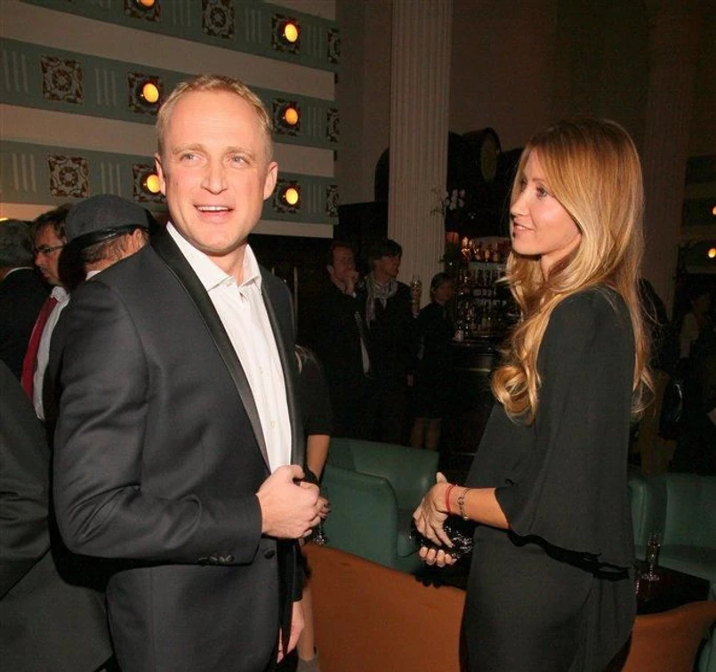 Piotr jak na dżentelmena przystało, przestawiał swoją znajomą kolegom. Tajemnicza blondynka pozwoliła sobie nawet na to, by publicznie objąć aktora.