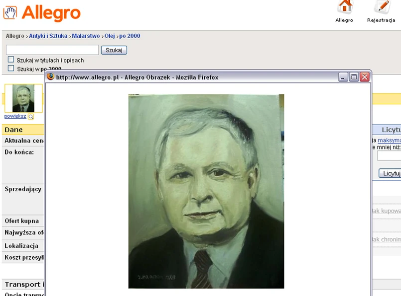 Allegrowicz lukasz22011990 raczej nie bawi się w politykę. Po prostu robi biznes i sprzedaje portrety znanych ludzi, jak leci. Ma w swojej ofercie Kaczyńskiego, Tuska, Małysza, Boruca, Kubicę, Jana Pawła II i Piłsudskiego. Z przebiegu licytacji wynika, że Polacy najbardziej cenią marszałka - 26 zł plus koszty wysyłki.