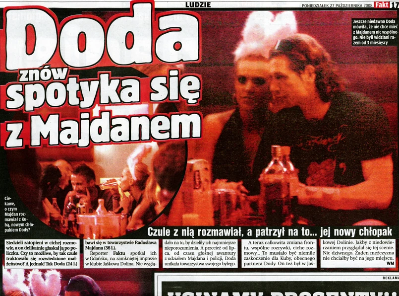Reporter "Faktu" spotkał parę na zamkniętej imprezie w klubie Jaśkowa Dolina. Majdan miał czule głaskać Dodę po policzku, a ona miała mu szeptać rozkosznie do ucha.