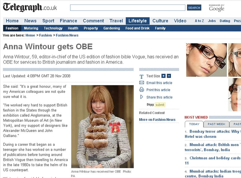 "To wielki honor, mimo że wielu moich amerykańskich kolegów nie ma pojęcia, co on oznacza" - dziękowała z dumą 59-letnia Wintour, dodając: "Pracowałam bardzo ciężko, by promować brytyjską modę w USA poprzez wystawę Anglomania w Metropolitan Museum of Art i poprzez wsparcie, którego udzieliłam projektantom takim jak Alexander McQueen i John Galliano".