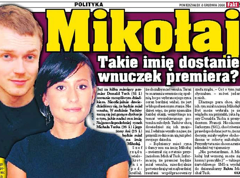 Dlaczego para chce, aby ich syn miał na imię Mikołaj? Być może wybrała je ze względu na przyjaźń, jaka łączy Donalda Tuska z prezydentem Francji Nicolasem Sarkozym, choć równie prawdopodobne jest to, że na decyzję miały wpływ obchodzone w sobotę mikołajki - czytamy w "Fakcie".