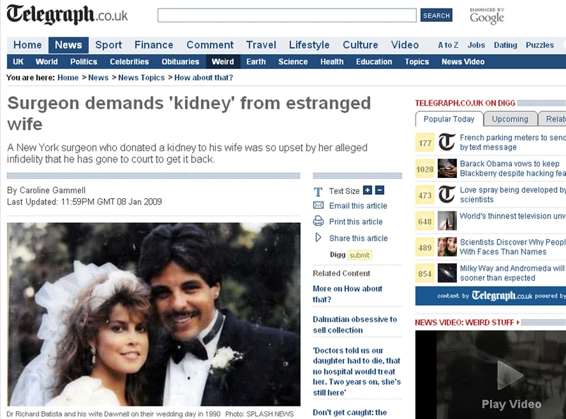 Richard Batista oczywiście doskonale wie, że nie da się przeszczepić mu na powrót własnej nerki, dlatego chce od byłej żony półtora miliona dolarów odszkodowania.