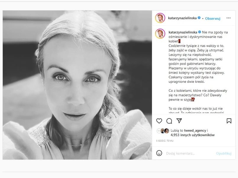 Jako że oskarżenia prezesa PiS dotyczą kobiet, to właśnie one są najbardziej aktywne, jeśli chodzi o wyrażanie emocji, które pojawiły się w nich z związku z krzywdzącymi stwierdzeniami. Mniej i bardziej znane kobiety ciągle dołączają do grona tych, które publicznie nie godzą się na tego rodzaju upokorzenia. Dziś post o tej tematyce pojawił się także na Instagramowym profilu Katarzyny Zielińskiej.