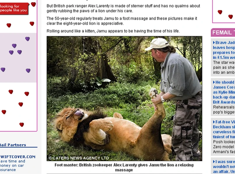 Alex Larenty jest strażnikiem w The Lion Park w Johannesburgu. Na co dzień opiekuje się wielkim lwem Jamu. 8-letni król puszczy uwielbia, gdy jego opiekun masuje mu upazurzone łapy. Lwi "tata" regularnie więc skrobie poduszki łap wielkiego kota, a dziki zwierz zachowuje się niczym udomowiony dachowiec. Nieustraszony trener zapewnia, że lew ma do niego wielkie zaufanie i nie zrobi mu krzywdy.