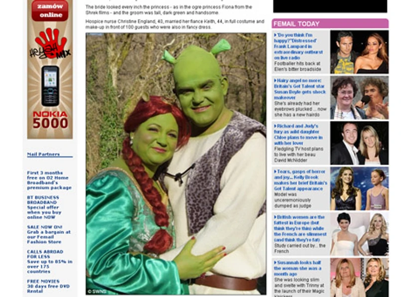 Świeżo zaślubiona pani Green (Zielona), pielęgniarka z Barnstaple w południowo-zachodniej Anglii, mówi, że każda dziewczyna marzy o ślubie jak z bajki. "Ja taki miałam, był lekko zakręcony i była przy tym kupa śmiechu. Keith jest trochę podobny do tego sympatycznego ogra, więc pomyślałam, że to mógłby być świetny motyw naszego ślubu. Strasznie śmiesznie wyglądały jego zielone uszka podczas składania poważnej przysięgi małżeńskiej. Musiałam jeszcze przekonać swojego syna, który jest już nastolatkiem, żeby się przebrał za Osła" - opowiada.