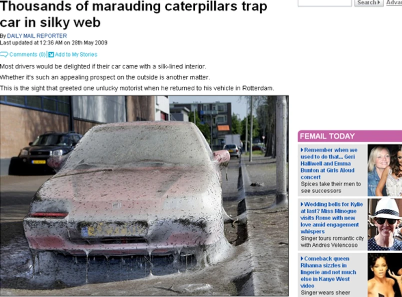 Nieprzyjemna, lecz zaskakująca przygoda spotkała pewnego Holendra, który nieświadomy zagrożenia, zaparkował swoją czerwoną maszynę w okolicach drzewa, które upodobały sobie larwy motyli. Gdy zobaczyły samochód, pomyślały, że ktoś zrobił im prezent i zostawił wielką porcję jedzenia. Zdecydowały się zaatakować biedną hondę.