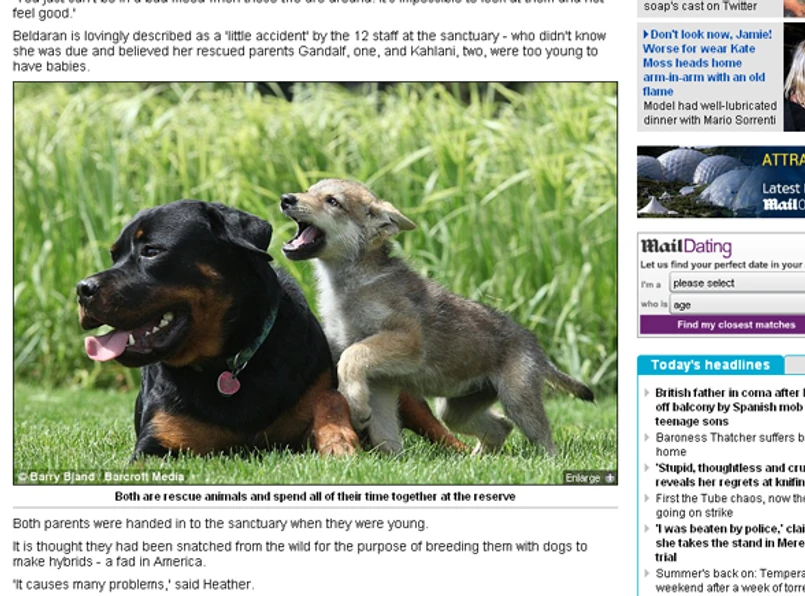 Postanowili znaleźć mu nowych rodziców. Niestety początkowo, nie udało się znaleźć żadnego psa, który zająłby się małym wilkiem. Na szczęście na horyzoncie pojawił sięrottweiler Ulrok. To była miłość od pierwszego wejrzenia. Od tego czasu stali się nierozłączni i stali się największą atrakcją rezerwatu. "Ta para łapie za serce wszystkich odwiedzających nasz zwierzyniec. Nie da się być w złym humorze, gdy tych dwoje bawi się w pobliżu. Patrzenie na nich każdemu poprawi humor" - mówi dyrektor rezerwatu Heather Grierson.