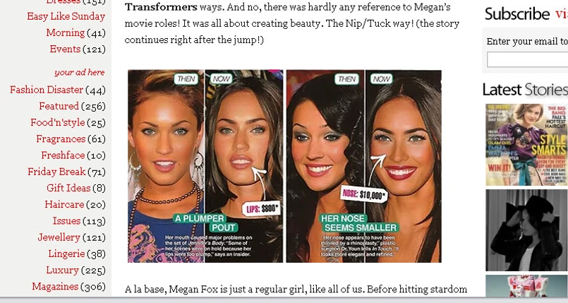 Na zdjęciach widać wyraźnie, że obecny wygląd Megan różni się od tego sprzed rozpoczęcia światowej kariery. Dla mniej wprawnego oka magazyn przygotował informacje, co i kiedy zmieniła w sobie panna Fox. Na pierwszy ogień poszły jej wydatne usta, które przedtem wyglądały troszkę inaczej. Później zajęła się swoim noskiem, ktory jej zdaniem niezbyt pasował do wizerunku seksownej gwiazdy. W związku z tym postanowiła go zmniejszyć.