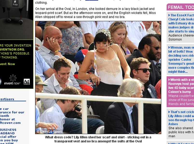 Gdy pojawiła się na trybunach stadionu Oval w Londynie, na którym rozgrywane są mecze krykieta, od razu wzbudziła zainteresowanie, szczególnie męskiej części publiczności. Po prostu nie ubrała nic pod swoją cienką różową koszulkę. Nic a nic się tym nie przejmowała i razem ze swoim chłopakiem po prostu oglądali z zainteresowaniem zawody tej typowo brytyjskiej dyscypliny sportu.