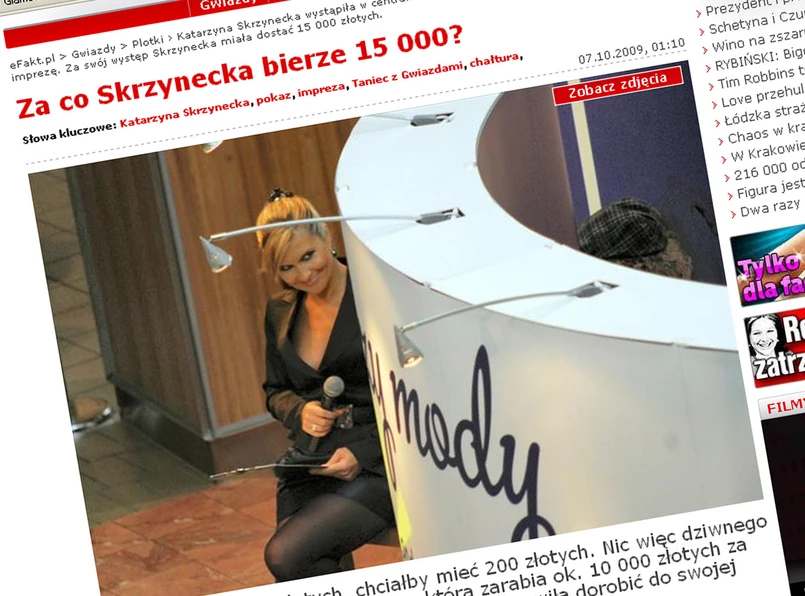 "Katarzyna Skrzynecka, która zarabia ok. 10 000 złotych za każde wydanie <Tańca z Gwiazdami>, postanowiła dorobić do swojej skromnej pensji i wzięła chałturę w centrum handlowym" - kpi "Fakt".