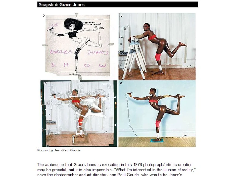 Nic dziwnego, że godziła się na dziwne pozy, stylizacje z piekła rodem czy retusz, po którym wyglądała jak przerysowana postać z kreskówki dla dorosłych. Jedno ze słynniejszych zdjęć Grace zrobił Jean-Paul Goude. Fotograf ustawił naoliwioną modelkę w ciekawej pozie. Wielu próbowało ją potem skopiować, twierdząc, że porażki są spowodowane budową ciała Jones – niesamowicie długimi nogami i rękami, krągłymi pośladkami i wiotkością. Bez tego się po prostu nie da, mówili.