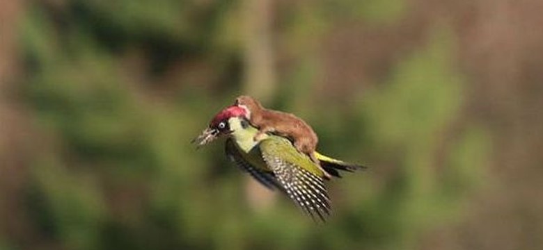Zdjęcie łasicy na plecach dzięcioła podbija sieć. MEMY