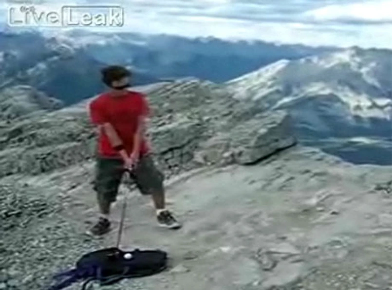 Bywają naprawdę zapaleni gracze w golfa. Tacy nie patrzą, czy słońce, czy deszcz, tylko biegną z kijami na pole. A co jeśli akurat w pobliżu nie ma przystrzyżonej trawy? Piłeczkę uderzyć można gdziekolwiek. Byle nie tak, jak ten golfista, który wdrapał się na górski szczyt.