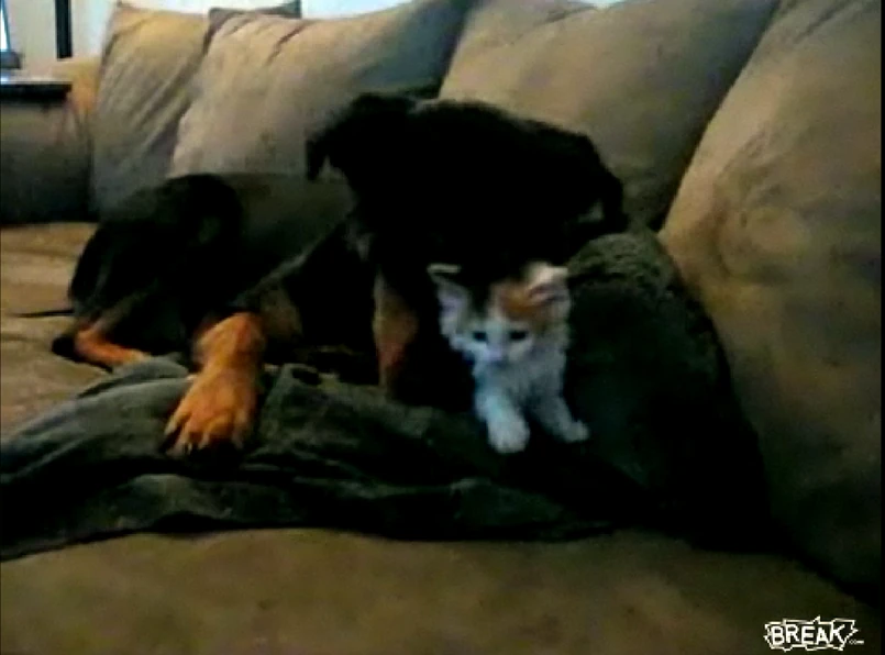 Jak można być tak okrutnym. Rzucać malucha na pastwę groźnego psa. Przecież ten rottweiler mógł go zalizać na śmierć. W końcu ile pieszczot może wytrzymać jeden malutki kotek?