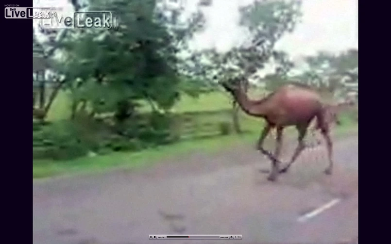 W wypadkach między dużymi zwierzętami a samochodzami cierpią zwykle obie strony. Na szczęście, tym razem, uderzony samochodem wielbłąd odszedł nieuszkodzony.