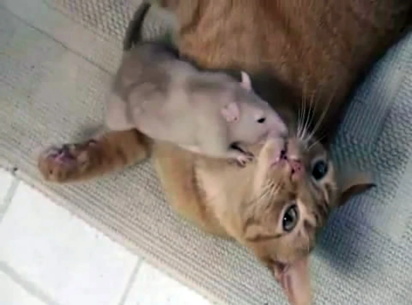 Kotka Ranj nie ma nic przeciwko, by szczur Peanut chodził jej po głowie, obgryzał futerko i generalnie, zachowywał się dokładnie tak, jak szczur nie powinien. O zachowaniu kotki nie ma co nawet pisać...