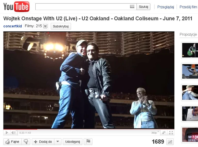 Na koncert U2 Wojtek z Poznania wybrał się aż do Oakland w Kalifornii. Na kartonie napisał: "Bono, leciałem 20 godzin, żeby znaleźć się na scenie z U2". Napis nie umknął uwadze lidera irlandzkiej kapeli - polski fan został zaproszony na scenę. "God bless America" - krzyknął do mikrofonu, czym wzbudził ogromny entuzjazm publiczności.