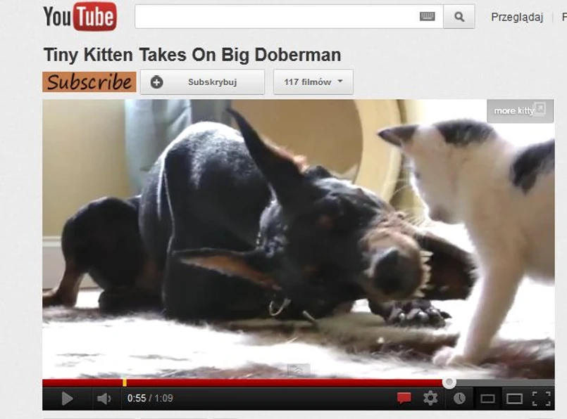 Ten mały kotek jest albo tak odważny, że nie straszne mu wielkie kły dobermana, albo tak głupiutki, że nie jest w stanie przewidzieć, co mogłoby go spotkać, gdyby psisko niechcący zatrzasnęło pysk. Tak czy inaczej, wideo pokazujące małego futrzaka zaczepiającego wielkiego psa robi wrażenia. Zobaczcie sami.