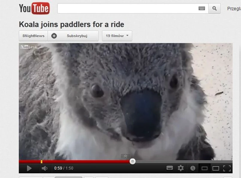 Misie Koala to zwierzęta raczej leniwe, które niechętnie wykazują jakąkolwiek aktywność poza spaniem i przeżuwaniem listków. Ten osobnik najwyraźniej jednak lubi przygody i podróże w towarzystwie ludzi. Zobacz, jak zabrał się z turystami na wyprawę kajakiem.