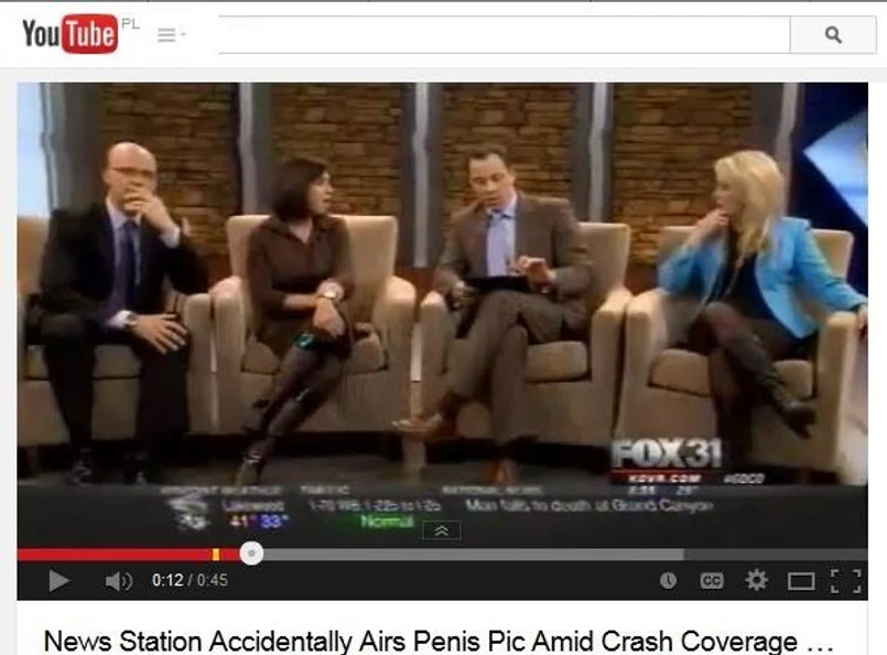 Telewizyjne redakcje powinny zawsze dokładnie sprawdzać zdjęcia z portali społecznościowych, przed pokazaniem ich na wizji. W przeciwnym razie bowiem, może skończyć się to tak żenującą wpadką, jak w poniższym wideo. Podczas, gdy na ekranie miały pojawić się zdjęcia z miejsca katastrofy helikoptera, widzowie zobaczyli Edwarda Nożycorękiego, burrito oraz ... męskie genitalia. Reakcja reporterów w studio bezcenna.