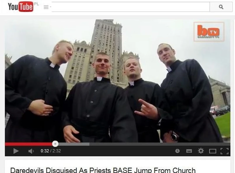 Osoby podziwiające panoramę z tarasu widokowego na ostatnim piętrze Pałacu Kultury musieli doznać prawdziwego szoku, gdy zobaczyli czterech księży wyskakujących przez okno. Jak się okazało, byli to przebrani za duchownych śmiałkowie, którzy przywdziali sutanny, by ukryć pod nimi swoje spadochrony. Takie skoki z Pałacu Kultury są bowiem zabronione, a dzięki kamuflażowi skoczkom udało się przemycić niezbędny sprzęt na górę.