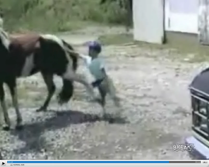 A tyle się mówi, żeby nie podchodzić do konia od tyłu, bo może się to źle skończyć. I nic. Jak grochem o ścianę. Dowiódł tego pewien malec, który mimo ostrzeżeń opiekuna chciał pokazać, że ma zadatki na kowboja. Całe szczęście, że maluch wyszedł z tego spotkania bez szwanku.