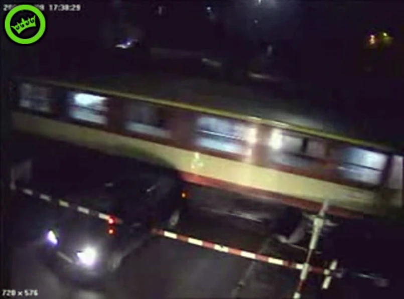 Kierowca i pasażer tego auta cudem uniknęli śmierci pod rozpędzonym pociągiem. Czego spodziewali się, stając samochodem pomiędzy szlabanami? Te, opuszczone w dół, to nie żółte światło, na którym można spróbować przejechać skrzyżowanie...