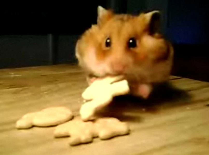 Niekoniecznie najzdrowsze to chomikowe jedzenie, ale ten maluch nie wybrzydza. Dostał, to wcina. Zakładamy, że wcinałby podobnie większość tego co jadalne. Taki mały futrzany balonik z oczami jak węgielki.
