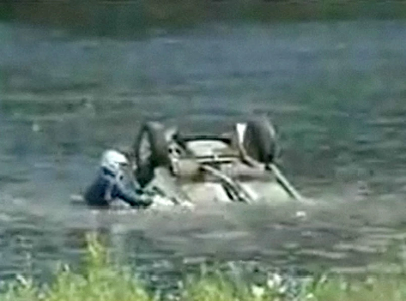 "Lewo pięćset, potem prawo dwieście i długa prosta". Mniej więcej takie komunikaty podają piloci swoim rajdowym kierowcom. Tym razem albo pilot się pomylił, albo kierowca go nie dosłyszał. Skończyło się kąpielą w jeziorze. Właśnie tam była meta dla tej załogi.
